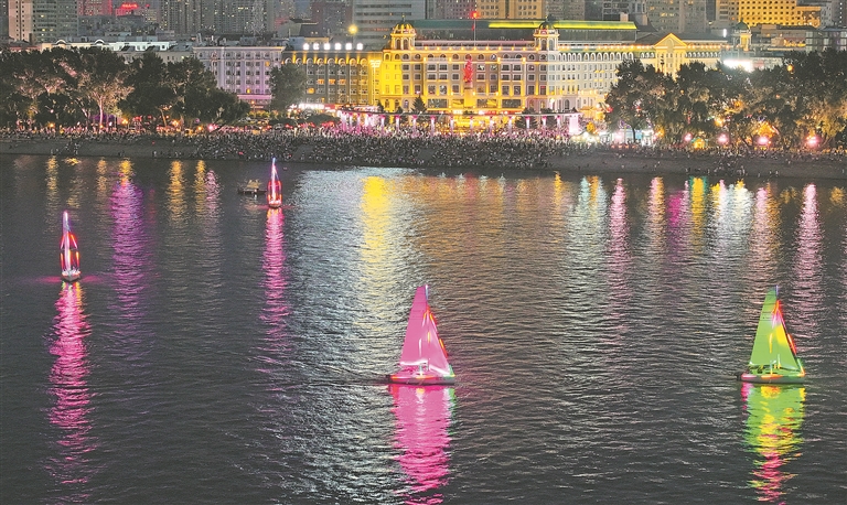 近日,松花江哈爾濱市道里區(qū)防洪勝利紀(jì)念塔江段,每晚都會(huì)有多艘靚麗的彩色帆船巡游表演。十幾艘白色帆船船身上變幻的4D彩飾燈,仿佛披著斑斕的霓裳,光影暈染在波光粼粼的江面,形成一道道淺淺的虹,讓夏夜的松花江愈顯美麗動(dòng)人。這是哈爾濱市總工會(huì)組織的職工帆船表演隊(duì),每艘帆船上安裝有百米長(zhǎng)燈帶、小型發(fā)電機(jī)和微電腦,形成4D燈光秀效果,每天9時(shí)30分至11時(shí)、19時(shí)30分至21時(shí)表演。