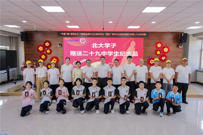 北大學子向齊市二十九中學生贈送紀念品并合影