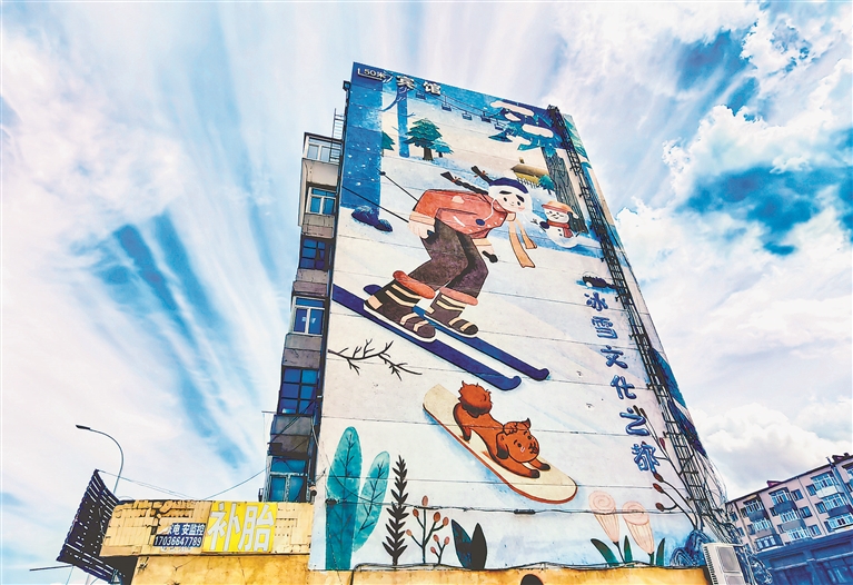 道外區(qū)火車頭街附近,一棟7層樓的外墻上繪制了滑雪運動的場景,吸引許多路人觀看;北馬路附近,一棟老樓的紅磚外墻也進行了彩繪,巨大的圖畫為當地增添了一道美景。本報記者 蘇強攝