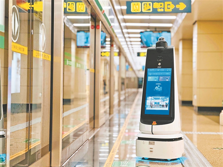 除了站務(wù)服務(wù)機(jī)器人,“機(jī)器人家族”中還有智能巡檢機(jī)器人,不僅能識(shí)別進(jìn)站客流量,還可以通過(guò)語(yǔ)音提醒乘客有序進(jìn)站、自覺(jué)排隊(duì)和主動(dòng)安檢,維護(hù)站內(nèi)秩序;在巡檢過(guò)程中對(duì)站內(nèi)設(shè)施進(jìn)行高溫預(yù)警、環(huán)境溫濕度感知、空氣質(zhì)量檢測(cè);對(duì)站內(nèi)消防設(shè)備是否齊備、是否存在“跑冒滴漏”等情況進(jìn)行監(jiān)測(cè),發(fā)現(xiàn)異常及時(shí)預(yù)警。