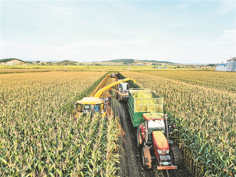 本報訊(崔倫震 記者劉暢)8月28日,在北大荒集團(tuán)黑龍江八五一一農(nóng)場有限公司第二管理區(qū)青貯玉米地塊,一臺大型青貯玉米收割機(jī)正在進(jìn)行收獲作業(yè),滿載青貯玉米的大馬力拖拉機(jī)一輛又一輛交替轉(zhuǎn)運(yùn),井然有序,一派繁忙的豐收景象。