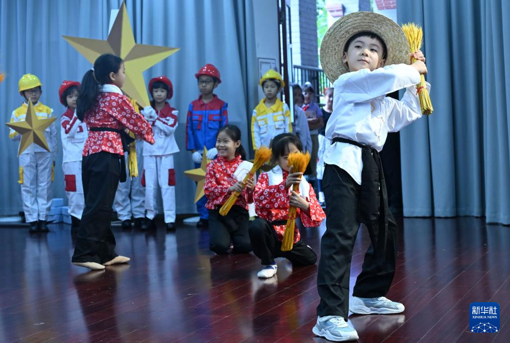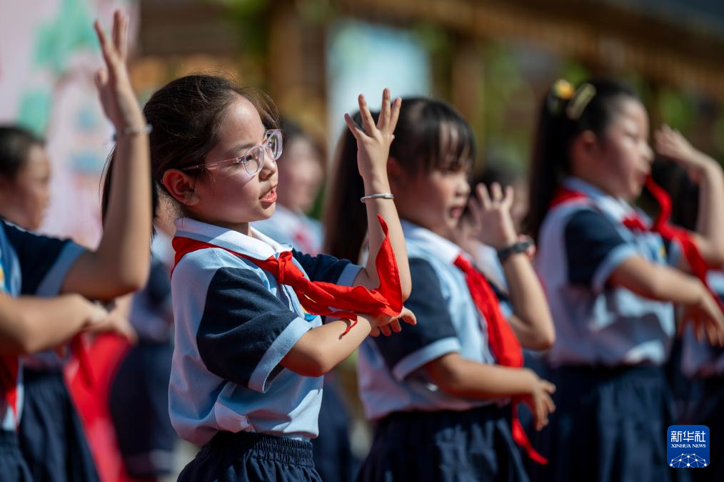 9月30日,湖北省黃石市沈家營(yíng)小學(xué)的小朋友們?cè)谟瓏?guó)慶活動(dòng)上表演節(jié)目。新華社記者 伍志尊 攝