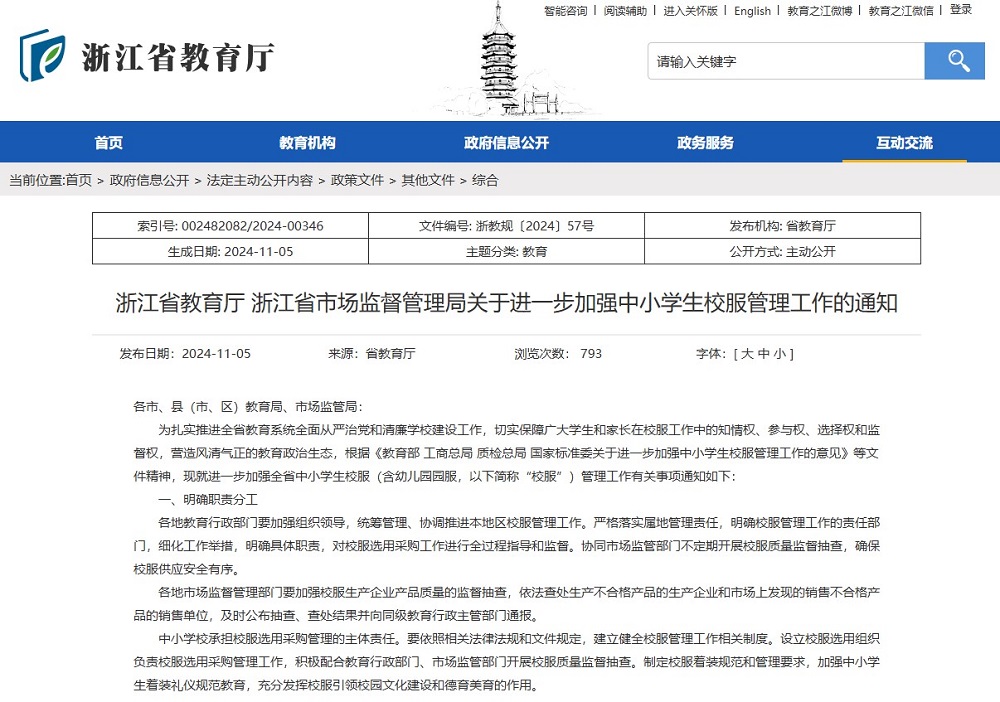 作為服裝產業(yè)發(fā)達省份,浙江省一直注重校服質量。如2014年浙江省教育廳聯(lián)合浙江省質量技術監(jiān)督局發(fā)布《關于進一步加強學生服裝和床上用品管理工作的通知》;2018年,浙江省質監(jiān)局聯(lián)合教育廳、工商局聯(lián)合發(fā)布了《浙江省學生服質量提升行動工作方案》;2022年10月,浙江省《教育收費政策(2022年)》規(guī)定學校收取服務性收費和代收費,堅持學生自愿和非營利原則,不得與學費、住宿費合并統(tǒng)一收取,不得從中牟利。
