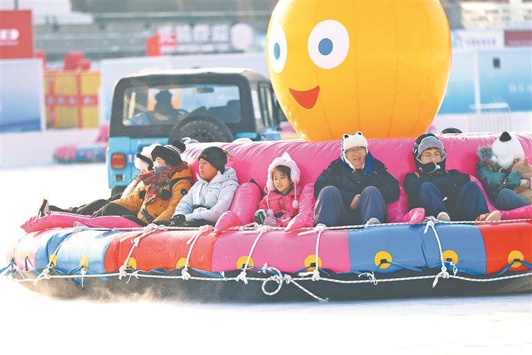 記者站在堤壩望向松花江面看到,江面被有序劃分為多片區(qū)域,每片區(qū)域都是一個歡樂場,游客可以體驗“瘋狂八爪魚”、大滑梯、龐巴迪賽車、滑冰,乘坐馬車、冰雪龍舟游覽園區(qū),還可以走進“馴鹿部落”體驗喂食馴鹿的樂趣。同時,熱飲屋、文創(chuàng)店、寄存處、餐飲店、防寒用品攤位等相關(guān)配套服務(wù)一應(yīng)俱全。
