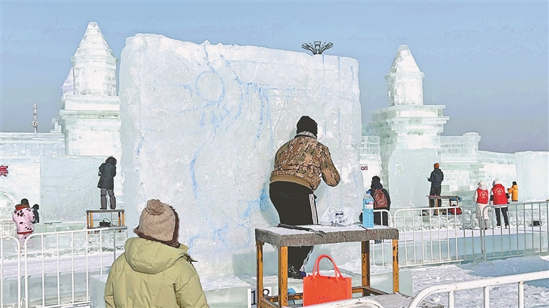 據(jù)了解,本屆冰雕比賽歷時(shí)3天,所有參賽作品將于1月4日雕刻結(jié)束,與游客見面。本報(bào)記者 馬智博攝