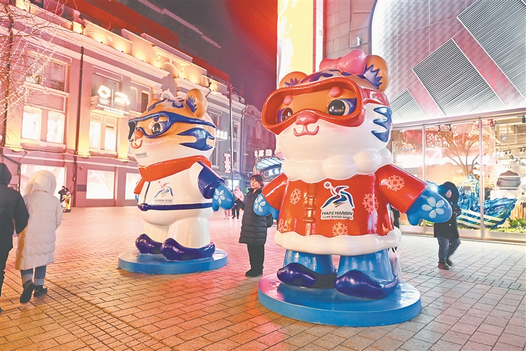 隨著亞冬會(huì)的腳步越來越近,哈爾濱市的大街小巷,隨處可見亞冬會(huì)元素,吉祥物“濱濱”和“妮妮”在街頭一直是游客和市民的萌寵。