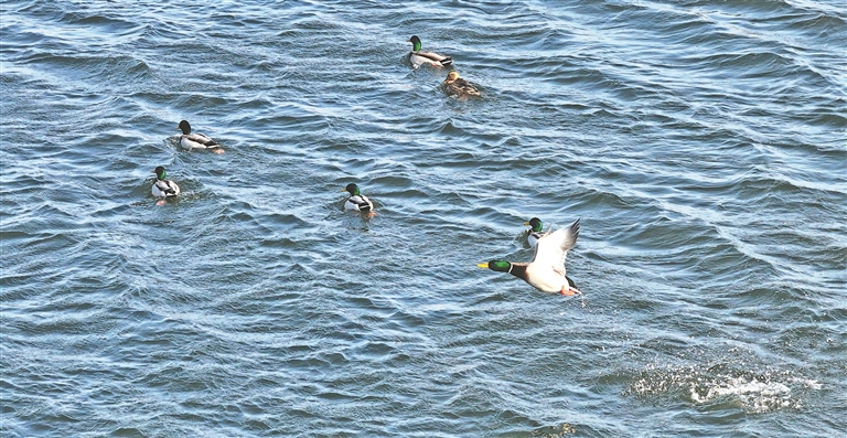 小野鴨融入湖中的一大群綠頭鴨,野鴨湖即將迎來春暖花開的季節(jié)。本報記者 張澍攝