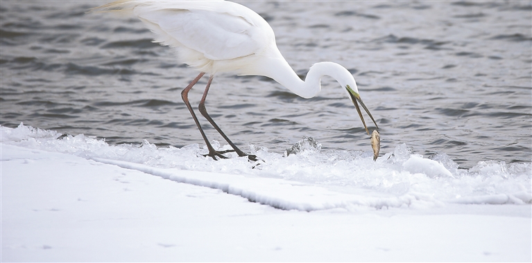 近日,松花江哈爾濱城區(qū)段船廠水域,江面局部已經碎裂成大大小小的冰排。一大群北歸的白鷺、蒼鷺以這些冰排為“釣臺”,站在上面伸長脖子,“垂釣”冰隙間露出的各種小魚。