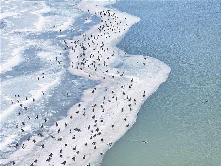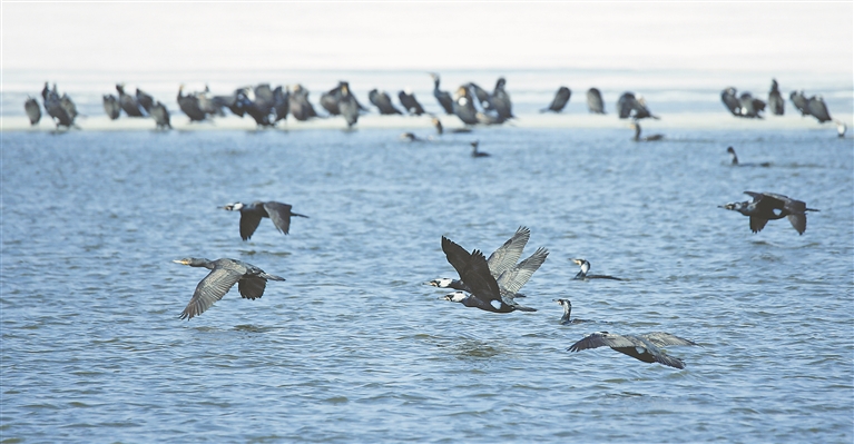 近日,松花江哈爾濱段出現(xiàn)大群的鸕鶿,它們?cè)诒诘乃苫ń暇墼谝黄?,觀察著江面魚類的蹤跡,一旦發(fā)現(xiàn)魚群,近千只鸕鶿就快速游過去,潛水捕起“開江魚”。