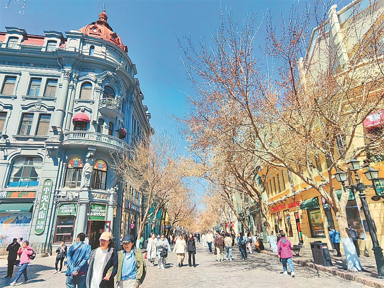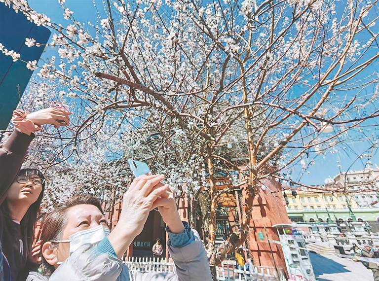 近日,哈爾濱市天空晴朗,空氣優(yōu)良,人們紛紛外出活動,盡享美好的春光。在松花江畔、中央大街、建筑藝術(shù)廣場,市民游客有的在觀賞美麗江景,有的在逛街購物,有的在拍攝盛開的桃花。