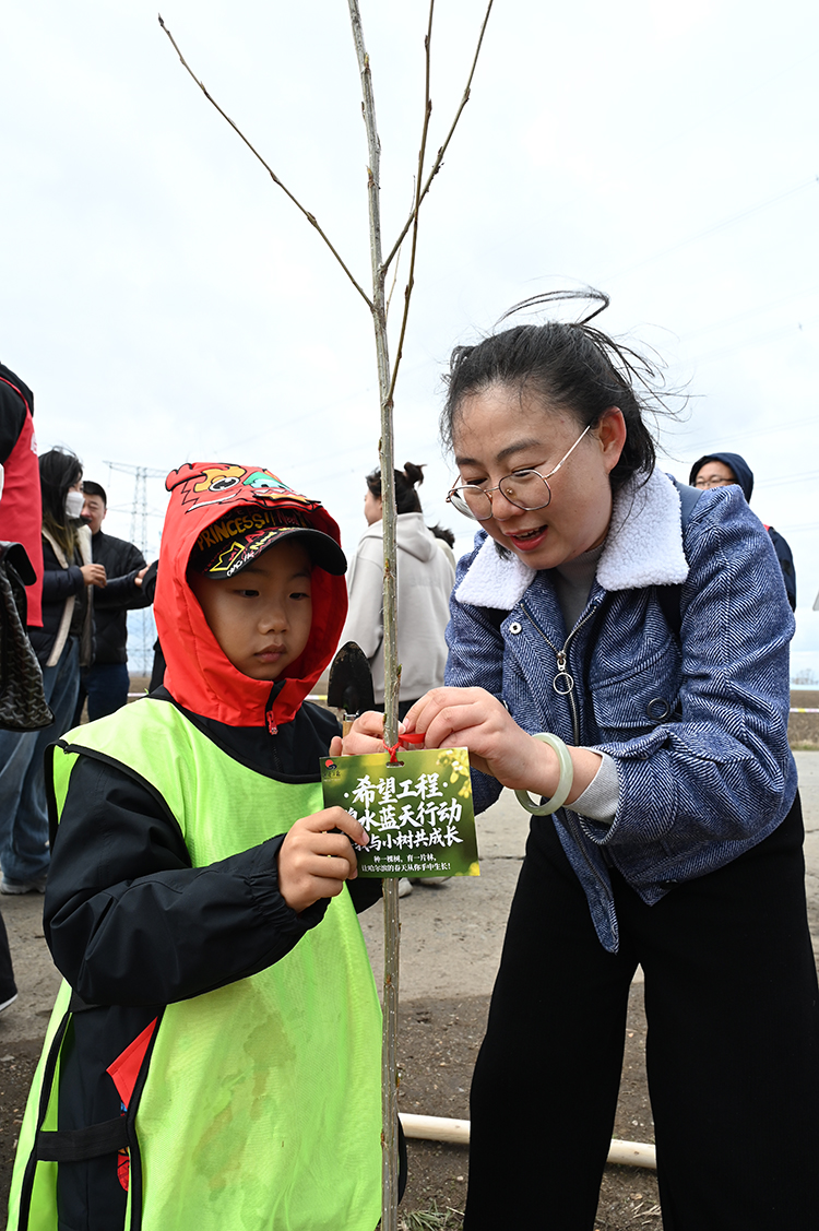 當(dāng)日上午,義務(wù)植樹隊(duì)伍集合出發(fā),分組領(lǐng)取工具并開展植樹技術(shù)交底?;顒?dòng)現(xiàn)場(chǎng),大家分工協(xié)作,揮鍬培土、扶苗澆水,共栽種樹苗100余株。每棵新植樹苗均懸掛“寄語(yǔ)卡片”,青少年們用文字和繪畫表達(dá)對(duì)未來(lái)的祝福,童心港灣學(xué)生代表以“‘我與小樹共成長(zhǎng)’ 愛(ài)綠護(hù)綠環(huán)保行”為主題,將生態(tài)環(huán)保與愛(ài)黨愛(ài)國(guó)情懷深度融合。隨后,舉行“希望林”揭牌儀式,象征著又一片綠色希望落地扎根。