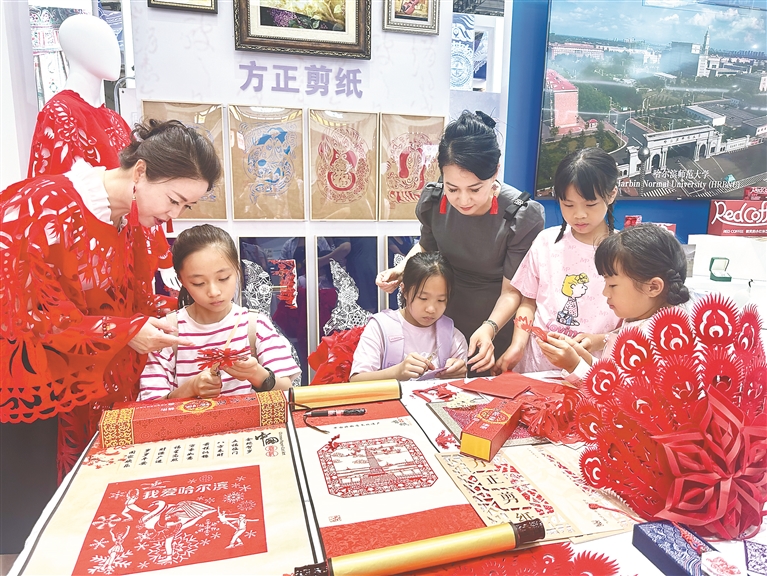 方正剪紙展區(qū)工作人員把剪紙穿在身上,手把手輔導小觀眾體驗剪紙技藝。本報記者 韓東賢攝