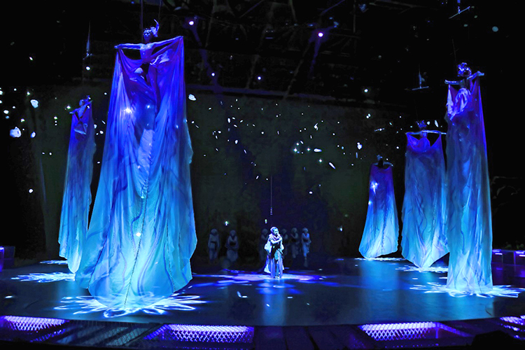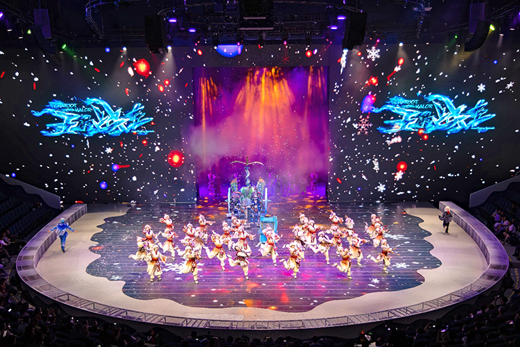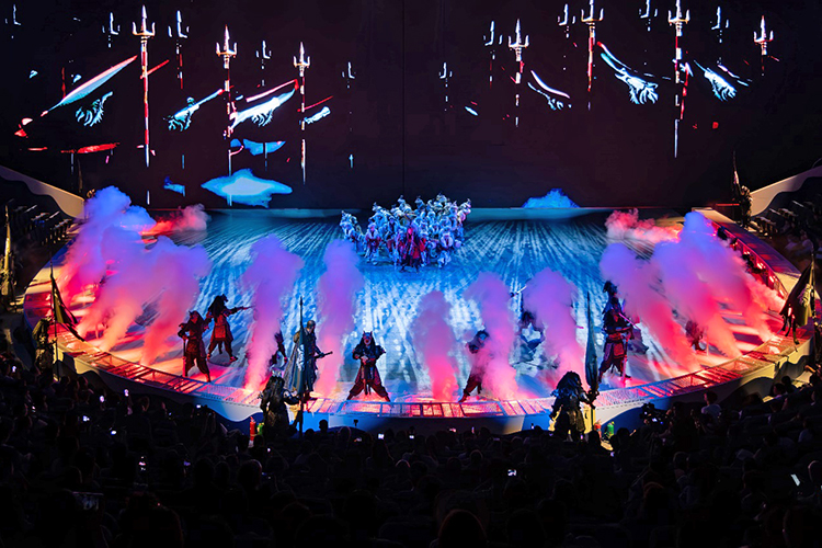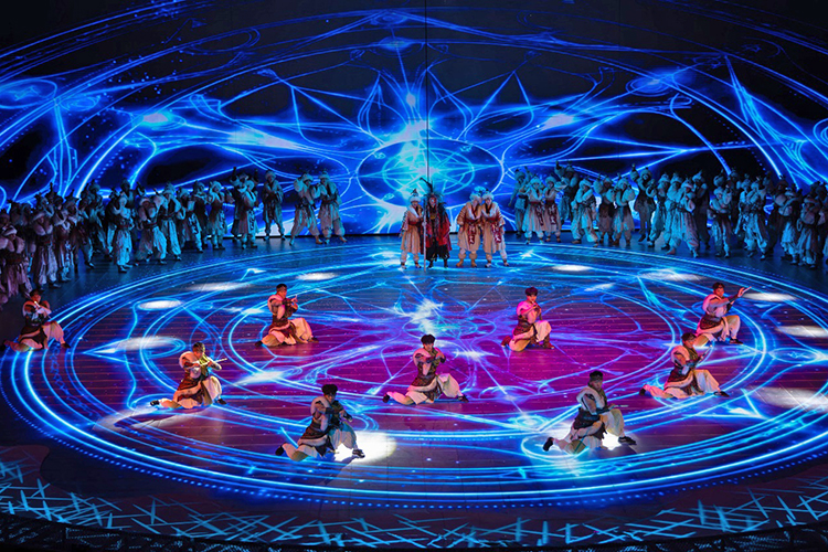 全新的演出以游戲玩家視角展開,當(dāng)游戲開始,巨大的環(huán)形地幕瞬間點(diǎn)亮,蒼茫的北境雪原鋪展開來,激光投影在穹頂交織出流動的光幕,與升騰的煙霧交融,千年前的部落場景躍然眼前。