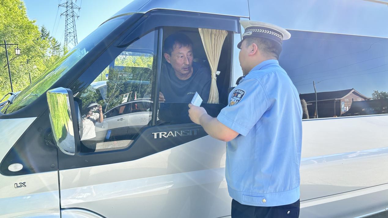 發(fā)放護(hù)游聯(lián)系卡時(shí),民警耐心地向駕駛車輛的游客介紹卡片的功能。為切實(shí)提升來(lái)呼瑪游客的體驗(yàn)感和滿意度,強(qiáng)化“護(hù)游”服務(wù),讓這張小小的卡片在警民之間搭起一座便捷暖心的溝通橋梁。