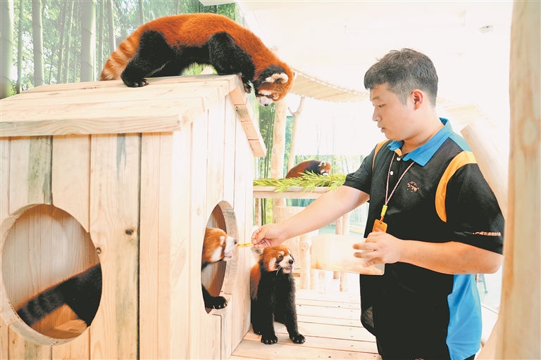小熊貓是國(guó)家二級(jí)保護(hù)動(dòng)物,野外種群數(shù)量不足萬(wàn)只。保育員團(tuán)隊(duì)精心準(zhǔn)備小熊貓的飲食,專門從四川空運(yùn)新鮮竹子并搭配多種營(yíng)養(yǎng)餐食,確保小熊貓們健康成長(zhǎng)。本報(bào)記者 董廣碩攝