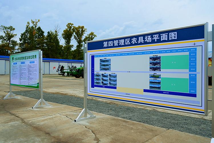走進引龍河農(nóng)場第四管理區(qū)的農(nóng)機具停放場,首先映入眼簾的是《農(nóng)具場擺放平面圖》,不同顏色的線條清晰標(biāo)注著拖拉機區(qū)、收獲機區(qū)、農(nóng)具存放區(qū)的位置。
