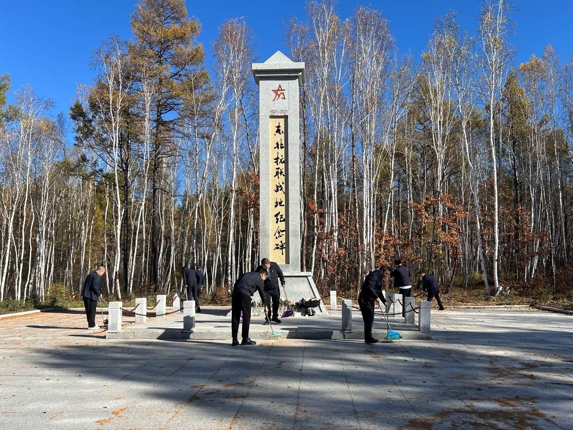9時(shí)40分,全體參與人員乘車(chē)前往革命烈士紀(jì)念碑墓地,開(kāi)啟致敬英烈活動(dòng)?;顒?dòng)現(xiàn)場(chǎng),全體人員手持清掃工具,認(rèn)真清理紀(jì)念碑周?chē)穆淙~與雜草,以實(shí)際行動(dòng)表達(dá)對(duì)革命先烈的緬懷與敬意。